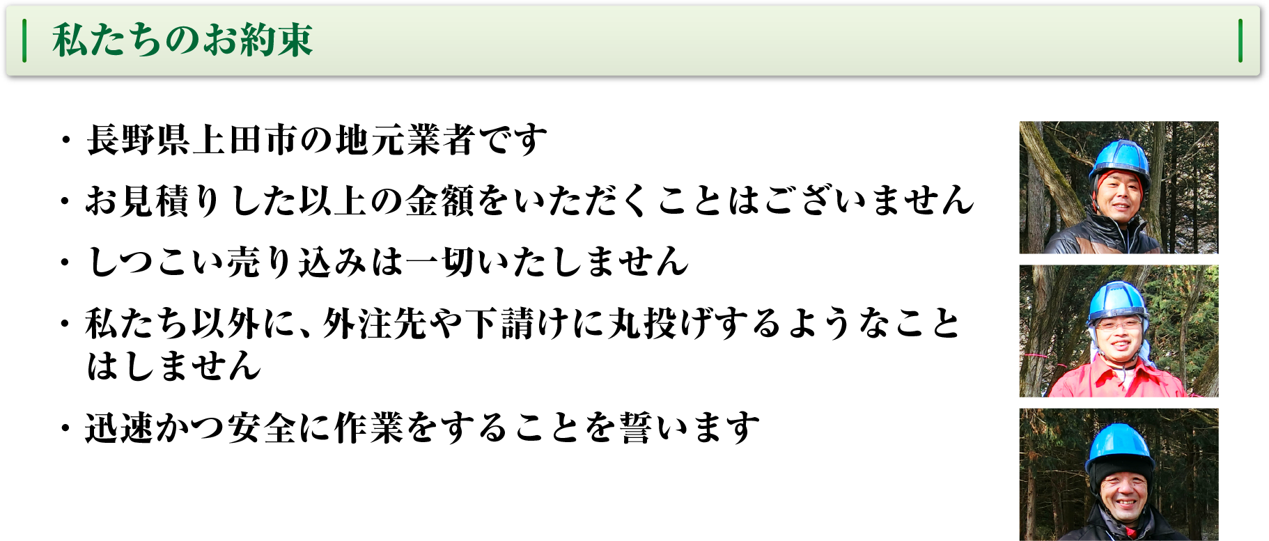 上田市在住で、常に東信地域を動き回っています。最短で当日にお伺いし、ご相談・お見積りを出させていただきます。大手ではございませんので、小回りを重視し、迅速な対応が弊社のモットーです。