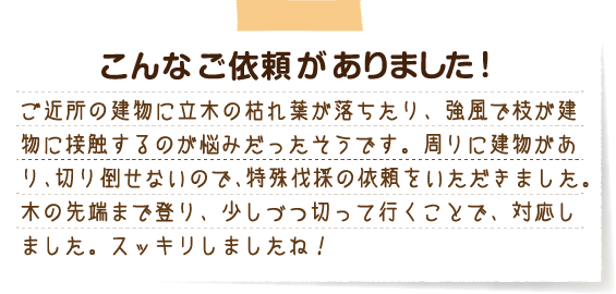 特殊伐採専門の弊社では、クレーン車が入れないような狭小地、建物に囲まれている高い木、根元から曲がって伸びている偏心木など専門スタッフが安全かつ正確に伐採いたします。